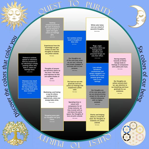 The six colors in the center of the board are the six colors of our being retained owing to our behaviors and emotions. The Sun and Moon indicate the cyclical nature of life. The tree of life, indicates finding purpose in our everyday activities. The flower of life with six colors indicates the point of self realization.